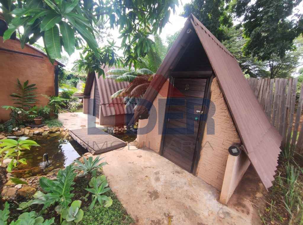 03 DORMITÓRIOS, SENDO UMA SÚITE C/CLOSET, SALA, COZINHA C/ARMÁRIOS, BANHEIRO SOCIAL, LAVANDERIA COBERTA, ÁREA DE LAZER COM CHURRASQUEIRA, FORNO, 2 DORMITÓRIOS, DESPENSA, BANHEIRO, PISCINA, QUIOSQUE COM CHURRASQUEIRA, 02 BANHEIROS, SALA AMPLA, LAGO ORNAMENTAL, CHALÉS, LAREIRA AO AR LIVRE E AMPLA ÁREA VERDE.